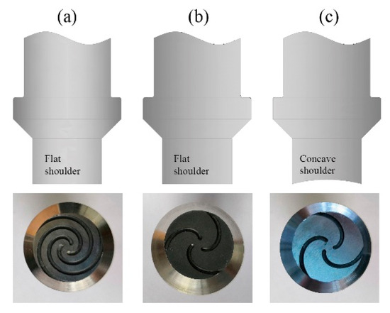Although P-FSSW could decrease the disadvantages of a keyhole, there are still some barriers to the widespread implementation in the manufacturing industry, including hook defect and the capability limitation of welding thick plates [16]. Innovative methods, changing of welding parameters, and optimization of tool geometries are mainly used to improve the joints’ properties. Li et al. [17] proposed FSSW plus subsequent friction stir welding (FSSW-FSW) to eliminate hook defect. Chiou et al. [18] proposed a probeless embedded tool to increase the friction coefficient and enhance heat generation during the welding process. Li et al. [12] employed an involute grooves tool for P-FSSW and investigated the effects of processing parameters on joint mechanical properties, microstructure, and morphology evolution. Liu et al. [19] found that the failure strength and surface quality of the joints welded by a six-groove tool were significantly improved. This study also suggested that grooves should not be too large or too far from the center of the shoulder. Xu et al. [20] found that the tool with a concave shape could assist the stirring of the material and accumulation and improve failure strength. So far, many research studies have been done to illustrate the effects of welding conditions on joint properties. However, studies about material interactions in joints welded with different tools are not sufficient. Further investigation is necessary to understand the mechanism of shoulder geometries during the P-FSSW process.