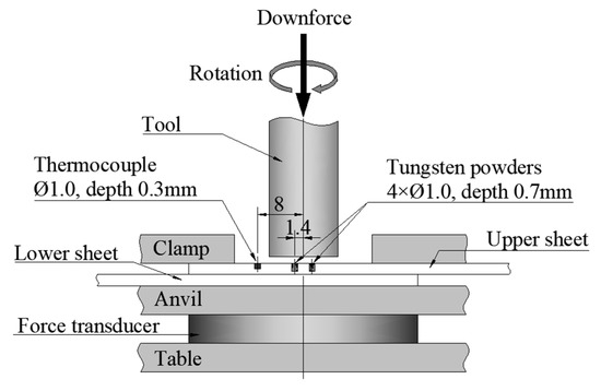 The experiments were conducted with a milling machine (BYJC Inc., Beijing, China), and the P-FSSW process was operated in the displacement control. A conventional steel anvil was used for welding. Acetone was used to clean the sheets before the welding processing. The influences of rotation speed, target plunge depth, and dwell time were investigated. The parameters of the P-FSSW process are shown in Table 2. The downward force was measured with a dynamometer system (Excon Technology Inc., Hangzhou, China). Temperature and material flow were also studied experimentally. As schematized in Figure 2, a K-type thermocouple was put into a blind hole (8 mm from the center) to record the temperature. Tungsten powders (diameter of 0.05 mm) were used to mark the flow track of the plasticized material. Four blind holes filled with tungsten powders were located at 1.4 mm from the center of the joints, so these marking powders could spread efficiently with the plasticized material flowing from the grooves.