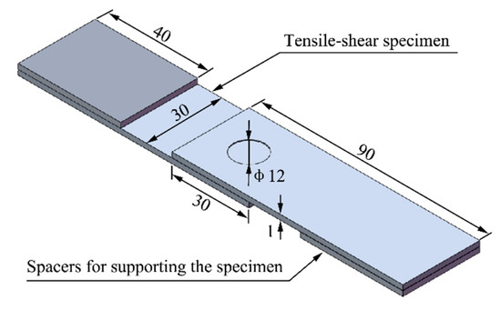 Tensile–shear tests were conducted using the MTS E45.105 tester (MTS Industrial Systems (China) CO., LTD, Shenzhen, China) with a speed of 2 mm/min to test the joint mechanical performance. The dimensions of the tensile–shear sample are shown in Figure 3. The failure strength for each condition was obtained according to the mean value of three tests. Subsequently, the fracture surfaces were analyzed with the scanning electron microscope (SEM, FEI Nova NanoSEM 450).