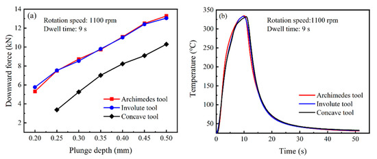 To investigate heat generation during P-FSSW, the rotational speed (1100 rpm), dwell time (9 s), and plunge rate (20 mm/min) were set constant for the three tools. It is worth noting that under the displacement control, the downward force was proportional to the plunge depth, as shown in Figure 4a. Therefore, it was feasible to obtain a similar downward force (the maximum downward force was 11 ± 0.2 kN) by setting a plunge depth during the P-FSSW process. The temperature variations during the processing are presented in Figure 4b. It was found that the peak temperature of the concave tool came later than the others. This phenomenon is attributed to incomplete tool–workpiece contact during the plunge stage, which was caused by the concave shoulder shape. The peak values and the temperature curves were found to be very close. This indicates that the features of the shoulders presented little effect on heat generation.