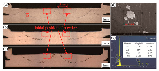 Distribution of tungsten powders in the cross sections of the joints produced by (a) the archimedes tool, (b) involute tool, (c) and concave tool and where (d) SEM image and (e) EDS spectra were obtained from region A.