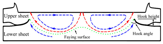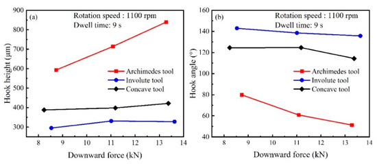 The characteristics of the hook defects in the different joints varied a lot. The hook defect was a partial metallurgical bond, which severely reduced the joints’ strength [25]. The plasticized materials of the lower sheet flew outward and upward to the upper sheet due to the push of the downward material at the center. Owing to the effects of this metallic material flow, the interface bended upward, and the hook defect with an inverted “V” shape was formed. This study used hook height and hook angle as the measurements of hook defect. As the schematic in Figure 6 shows, the hook height is described as the distance from the original interface to the top of the hook, and the hook angle is the angle of the “V” shape [23,26]. The surface characteristics of the shoulders and the welding parameters were dominant to the hook defect. As illustrated in Figure 8, for the archimedes tool, the hook height increased rapidly with the rise of the downward force, while the hook angle decreased quickly. However, both hook height and hook angle of the joints welded using involute and concave tools were slightly affected by the axial force.
