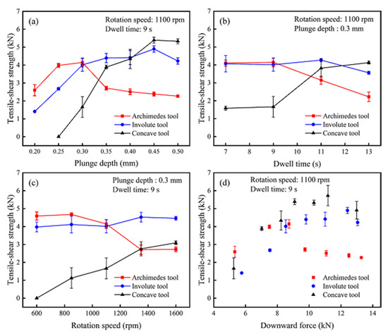 Evolution of tensile–shear strength with (a) plunge depth, (b) dwell time, (c) rotation speed, (d) downward force.