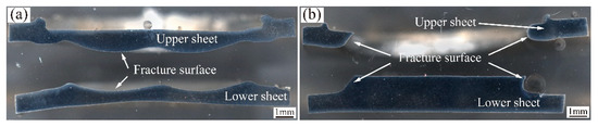 For the joints welded with different tools, two fracture modes (shear fracture and plug fracture) were found for lap shear testing, as shown in Figure 10. Figure 10a presents shear fracture mode in which two plates were sheared off along the interface of both plates. Figure 10b presents plug fracture mode that was caused by the thickness reduction of the joints. The plug fracture occurred along the extension of the hook outside edge, and the SZ was completely left on the bottom sheet. Research studies have confirmed that plug fracture is detrimental to joint strength [12,15,27]. At the parameters of a rotation speed of 1100 rpm and dwell time of 9 s, for the archimedes tool, when the plunge depth was greater than 0.3 mm, the joints were broken in the form of a plug fracture. The plug fracture led to the decrease of joint strength, as shown in Figure 9a. In the case of the involute tool, shear fracture was observed when the plunge depth was lower than 0.50 mm. For the concave tool, the plug fracture of the joint was observed when the target plunge depth exceeded 0.55 mm. Increase of plunge depth led to better interaction of the welded materials. For the concave tool, joint strength increased with aplunge depth of about 0.55 mm.