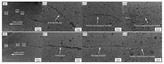 Figure 12 presents the cross sections and the interfacial bonding of the joints with different tools under the same rotation speed (1100 rpm), dwell time (9 s), and downward force (11 ± 0.2 kN). A considerable difference between the interfacial metallurgical bond was found at the hook region after etching. The unbonded region, kissing-bonded region, and partial metallurgical bonded region existed in sequence from the periphery of the joint to the inside of the hook. Figure 12a shows the joint welded by the concave tool; a typical kissing bond existed at the outside of the hook, as shown in Figure 12a1. Next to this region was the partial metallurgical bonded region (Figure 12a2), where intermittent voids and discontinuous oxide particles occurred. On the inside of the hook (Figure 12a3), the initial layered surface oxide was broken into small particles, and the partial bonding became less prominent. All of these characteristics indicated severe plastic deformation at the regions near the hook defect. Figure 12b presents the joint welded with the involute tool. As shown in Figure 12b1, the unbonded region propagated till the top of the hook, and the interface at the top of the hook was a typical kissing bond (Figure 12b2). In addition, the original interface oxide still existed as long segments on the inside of the hook (Figure 12b3). The difference in interface characteristics between the two joints suggests the advantages of the concave tool in enhancing the mechanical effects in the area near the hook.