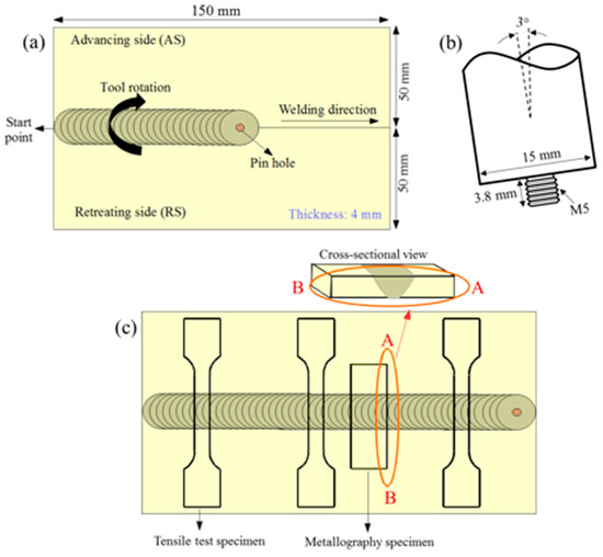 Schematic of the friction stir welding (FSW) process: (a) butt joint configuration, (b) FSW tool, and (c) location of the machined specimens.