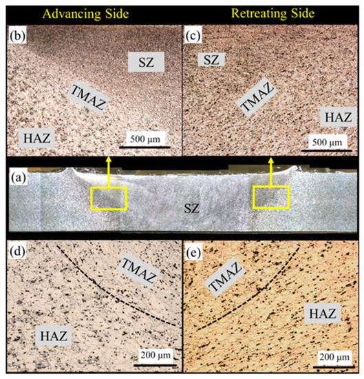 Microstructure of similar joints of Al6061(T6) at Sample C-1: (a) cross section view; (b,c) low-magnification advancing side (AS) and retreating side (RS), respectively; and (d,e) high-magnification views of (b,c), respectively.