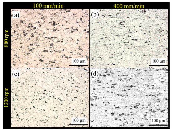 Figure 5 presents the SZ microstructures of the welded samples at rotational speeds of 800 and 1200 rpm and travel speeds of 100 and 400 mm/min. The dissolution of precipitation hardening particles occurred as a result of increased rotational and travel speeds. The figure shows that the microstructures of the SZs showed more recrystallized fine grains compared with that of the BM. At a constant travel speed of 100 mm/min, no significant increase in grain was observed with the increase in rotational speed. However, at a constant rotational speed, an increase in the grain size of the SZ was determined by an increase in the welding travel speed due to the low heat input and plastic deformation reduction. When the rotational speed of the FSW was constant, the amount of plastic deformation and heat exposure at the welding zone decreased with the increase in travel speed during welding. According to the recrystallisation principle, coarse recrystallized grains are caused by the decrease in plastic deformation during welding [34]. A small and fine grain microstructure was obtained because of the reduction in heat input during welding. Thus, the grain size was affected by two factors, i.e., plastic deformation and heat input [35].
