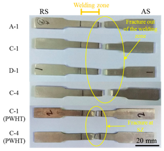 The failure position of similar-joint samples was examined under different welding parameters (Figure 11). All the defect-free FSW samples exhibited a necking phenomenon at the fracture location under all welding conditions. Figure 11 presents the fracture locations of similar joint samples outside the welding zone. Fracture and necking occurred at the HAZ adjacent to the TMAZ [48]. This fracture was located after the tensile test of all similar FSW samples under different welding parameters. The failure position of the PWHT Al6061(T6) samples was also examined under different welding parameters. Fracture and necking occurred at the center of the PWHT samples (Figure 11). The same fracture area was formed after the tensile test for the other PWHT samples.