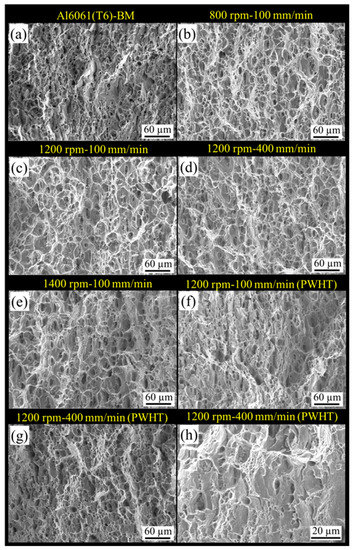 The fracture surface of similar FSW samples was analyzed under different welding parameters by SEM (Figure 12). As seen in Figure 12a, the size of the dimples on the fracture surface of Al6061(T6)-BM differed from those of similar-joint samples. The size of the dimples in the BM was smaller than those in similar-joint samples without heat treatment. This was the manifestation of higher tensile strength of the BM compared with those of the welded samples, as shown in Figure 12b–e. The shallow and a smaller number of dimples observed on the fracture surfaces in the welded samples indicated a lower ductility in welded joints [41,49].