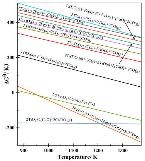 In this study, initial theoretical analysis was performed using the thermodynamic database and thermodynamic software FactSage7.2. For a temperature range from 873 to 1273 K and a step change of 20 K, the ΔGθ and the theoretical decomposition voltages (type 1) that describe the possible electrode reactions during the direct reduction process can be calculated. These calculations are given in Table 2. Origin software was used to linearly fit the calculated values to obtain the relationship between ΔGθ and temperature, as shown in Figure 5.