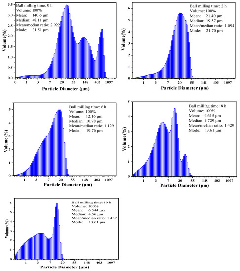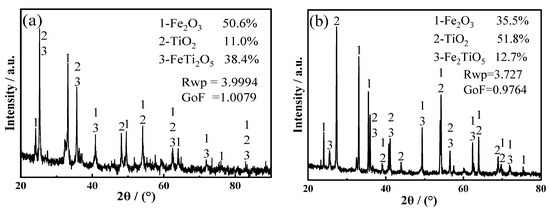 The XRD patterns in Figure 6a,b illustrate the main phases present in the sample after high energy ball milling and high temperature heat treatment, respectively. Fe2O3, TiO2, FeTi2O5 and Fe2TiO5 were identified in XRD patterns, and the particle size was reduced from 48.11 to 4.55 μm after milling, as listed in Table 4 and Figure 7.