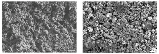 The SEM images in Figure 6c,d illustrate the effect of the high-temperature heat treatment on the cathode material. After the sintering of the cathode material at high temperature, the porosity increased and the particles were interconnected with each other. The electrical conductivities of the sintered cathode pellets increased from 10−7 to 10−6 S/cm before sintering and up to 10−4 to 10−2 S/cm afterward.