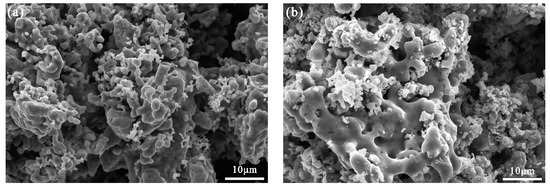 The microstructures of the products obtained using different ratios of the raw material are shown in Figure 8a–e. As the proportion of Ti in the raw materials was increased, the particles of the product appeared more densely packed, which is consistent with the apparent increase in solubility from the macroscopic appearance in Figure 8f. Table 5 contains a summary of the elemental compositions of the products for which the atomic ratio of Ti and Fe in the product is similar. As the content of Ti in the electrolytic product increases, the quantity of the β-Ti(FeTi4) phase increases, and the β-Ti phase takes the form of a metastable alloy Fe1−xTix (x < 0.8) [19], which is a relatively dense alloy. This could be explained by the increased density of the cathode. At an atomic ratio of Ti:Fe = 1.2:1, the micromorphology of the product is more uniform and demonstrated a sponge-like structure.