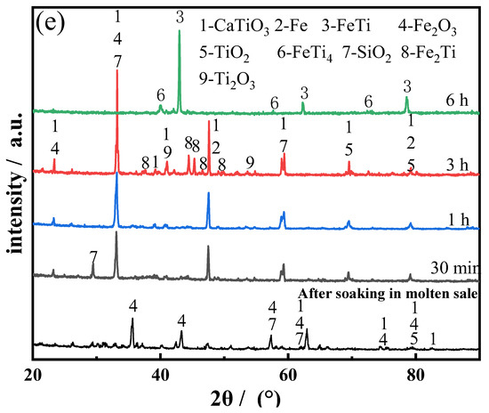 The electrolytic product was analyzed by EDS for three times and the average values are shown in Table 5. With an increase in Ti, the C content in the product decreased, but impurities such as Si and Ca increased. A higher iron content, e.g., Ti:Fe = 1:2, will increase the electrical conductivity of the cathode and speed up the electrolytic process. Owing to the lower decomposition voltage of Fe, it was preferentially reduced compared to Ti, making the cathode material porous (Figure 8f). As the proportion of Fe atoms decreased, the content of FeTi4 in the product increased, producing a dense cathode structure and limiting the infiltration of carbon powder; this explains the gradual decrease in the carbon content. Based on our previous research [20], the lower porosity limits the transfer of electrons and oxygen ions, and this affects the electrolysis process. This is also the primary reason for the gradual increase in impurities (O, Si, and Ca). The microstructure of the product is sensitive to the ratio of Ti:Fe. Based on these results, the optimum raw material composition for the production of Fe–Ti alloys is Ti:Fe = 1.2:1.