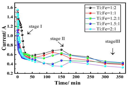 Current–time curves display the three stages of electrolysis of the raw materials with different Ti:Fe element ratios.