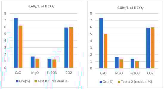 Consequently, the dissolution of the U was favored more easily with 0.6 g/L of HCO3−, and only 8.70 days was needed to achieve high recovery leaching time. The lower limit of HCO3− concentrations in the aforementioned tests shows a slightly gentle process fluctuation as compared to those on the higher side, and a general improvement in the recovery was observed as the HCO3− concentrations increased from 0.8 to 1.2 g/L during the process. The effect of varying concentrations of the leaching agent (HCO3−) on U recovery was studied by Elizângela and Ana [56]. Results obtained from the authors showed that 1.00 mol/L of HCO3− was the best concentration, under which >95% recovery was obtained in 24 h via alkaline leaching, while a general improvement in the recovery was observed as the HCO3− concentrations increased. However, the highest recovery of 86%, as a special result, was obtained from test #1 with 0.6 g/L of HCO3−. The lowest recovery of the 0.8 g/L HCO3− test may be due to lower bicarbonates and the constantly stable concentration of HCO3− as U recovery may highly correlated with it [57]. The geochemical analysis results of ore and residuals are shown in Table 8. It can be seen that the CaO concentration in all test residues was decreased significantly. This may be due to the injection of CO2 gas causing the dissolution of calcite (Figure 6), as shown by Equation (1):