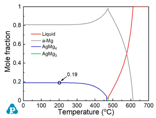 Calculated equilibrium mole fraction of phases as a function of temperature for a binary Mg–15Ag (wt.%) alloy using the PANDAT software.