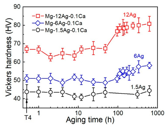 Figure 3 shows the age-hardening response of T4-treated Mg–xAg–0.1Ca alloy sheets (x = 1.5, 6 and 12) during isothermal aging at 170 °C. The 1.5Ag containing alloy sheet shows a low Vickers hardness value of 41.4 HV in the initial condition (T4), and it exhibits a negligible age-hardening. Increasing the Ag content not only leads to a higher hardness value in the T4-treated condition but also enhances the age-hardening response during aging. The 6Ag containing alloy sheet and the 12Ag containing alloy sheet show hardness values of 51.1 HV and 67.0 HV, respectively. After aging for 336 h, the hardness value of the former is increased to 57.4 HV, and that of the latter is increased to 80.0 HV. Table 2 summarizes initial hardness, peak-hardness, time to reach peak hardness and hardness increment of Mg–xAg–0.1Ca alloy sheets.