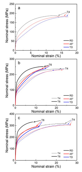 Tensile curves obtained from (a) T4-treated Mg–1.5Ag–0.1Ca alloy sheet, and T4- and T6-treated (b) Mg–6Ag–0.1Ca and (c) Mg–12Ag–0.1Ca alloy sheets along RD, 45° and TD at RT.