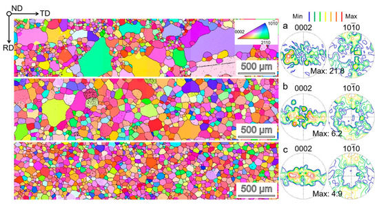 Figure 5 show EBSD inverse pole figure (IPF) maps and corresponding (0002) and (100) PFs obtained from the T4-treated 1.5Ag, 6Ag and 12Ag containing alloy sheets. The 1.5Ag containing alloy sheet shows a coarse-grained microstructure of ~277 μm, and abnormal grain growth occurs. Increasing the Ag content to 6 wt.% refines the microstructure and the average grain size is decreased by about one half (~124 μm). In addition, the microstructure homogeneity is enhanced. An increased addition of the Ag content to 12 wt.% causes further refinement in the microstructure. It is to be noted that a homogeneous microstructure consisting of equiaxed grains with an average grain size of ~74 µm is developed in the 12Ag containing alloy. All alloy sheets show a TD-split texture, in which the (0002) basal poles are tilted toward the TD.