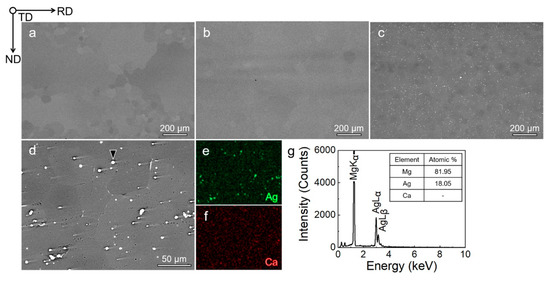 Backscattered electron (BSE) images showing microstructures of T4-treated (a) Mg–1.5Ag–0.1Ca, (b) Mg–6Ag–0.1Ca, and (c) Mg–12Ag–0.1Ca alloy sheets. (d) BSE image, and corresponding (e) Ag and (f) Ca elemental maps obtained from the Mg–12Ag–0.1Ca alloy sheet. (g) EDS spectrum obtained from a second phase particle (marked with a triangle) in (d).