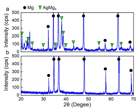 Figure 9a shows the XRD pattern obtained from the T6-treated Mg–12Ag–0.1Ca alloy sheet. For the purpose of comparison, the XRD pattern obtained from the T4-treated sheet is given in Figure 9b. As can be seen that the T4-treated sample mainly consists of ɑ-Mg phase. After the T6-treatment, new peaks are clearly observable, and they are confirmed to be generated mainly by MgAg4 phase. Therefore, the improvement in the tensile yield strength is associated with the formation of AgMg4 precipitates by the T6 treatment.