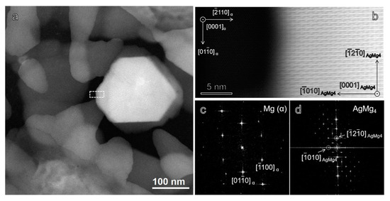 To know whether there is an orientation relationship (OR) between AgMg4 phase and ɑ-Mg matrix, further microstructure analysis was carried out on the T6-treated 12Ag containing alloy sheet. Figure 10a shows the HAADF-STEM image with the zone axis of [0001]ɑ, and Figure 10b shows the high resolution (HR) HAADF-STEM image that is enlarged from the rectangular region in Figure 10a. Figure 10c,d are the fast Fourier transform (FFT) patterns generated from the left-hand region and right-hand region of Figure 10b, respectively. Analysis of these patterns reveals that left-hand region is the α-Mg matrix with the zone axis of [0001]ɑ and the right-hand region is the AgMg4 phase with the zone axis of [0001] AgMg4. By further analyzing the FFT patterns, the OR between the α-Mg matrix and AgMg4 is confirmed to be (0001)ɑ ǁ (0001)AgMg4, [110]ɑ ǁ [100]AgMg4.