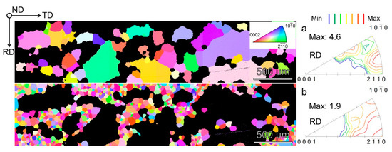 EBSD IPF maps and corresponding inverse pole figures showing textures of (a) abnormally coarse grains and (b) normal-size grains in the T4-treated Mg–1.5Ag–0.1Ca alloy sheet.