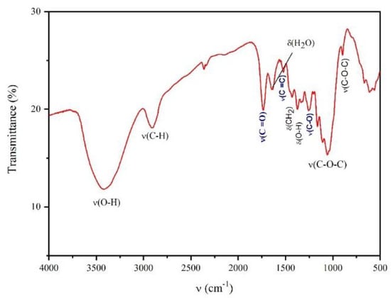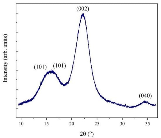 Some broad diffraction maxima were registered in the XRD patterns of the obtained sample (Figure 1) at 2θ values of 15°, 16°, 22°, and 34° and can be attributed to the crystalline planes (hkl) (101), (10-1), (002), and (040), respectively [21,28,29]. In addition, several bands were observed between ranges of 4000 cm−1 and 500 cm−1 in the FTIR spectrum (Figure 2).