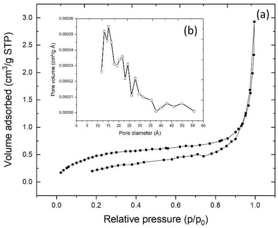 As can be seen in Figure 3a, the resulting adsorption–desorption isotherm corresponds to the Type IV BET isotherm [37]. This type of isotherm is characteristic of mesoporous solids (i.e., those with diameters between 2–50 nm). In addition, the formation of multilayers and a hysteresis loop was observed [15,38]. Using the BET model, the values for the total specific surface area (SBET), pore-volume (VT), and pore diameter distribution (Dp) were determined. The value obtained for SBET was 1.83 m2·g−1, that for VT was 0.0036 cm3·g−1, and that for Dp distribution ranged between 12 and 55 Å (1.2–5.5 nm), as shown in Figure 3b.