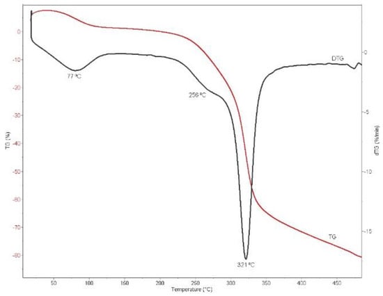 As previously described, three peaks were observed in the DGT curve. The first one, occurring between 50 and 120 °C, corresponds to the elimination of the adsorbed water and the solvents used for obtaining the bioadsorbent [39,40]. The next step of degradation is attributed to the decomposition of hemicellulose structures, which usually occurs in the 220–315 °C range [41]. Finally, the main stage of degradation corresponds to the depolymerization of cellulose. According to the literature, the decomposition of cellulose is found in the 315–400 °C range, with a maximum peak at 355 °C [41,42]. In the present case, this maximum was established at 321 °C. This slight shift could be related to the variation in the crystallinity of the evaluated sample compared to that reported in the literature [41,42].