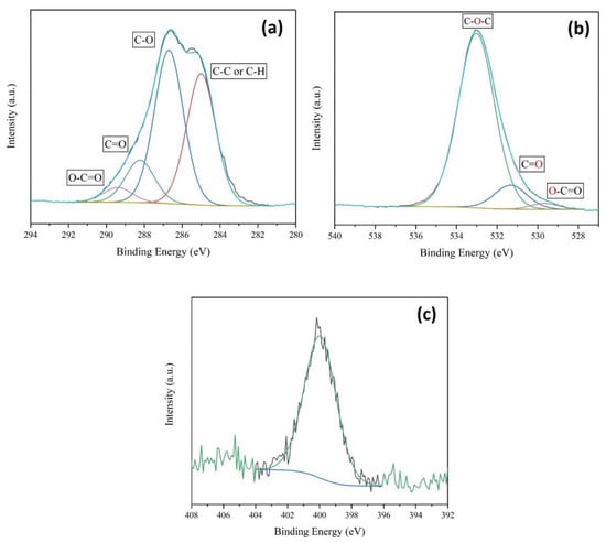 13C NMR was also investigated, where several peaks attributed to the cellulose structure were found in the obtained spectrum (Figure 5). The C 1s, O 1s, and N 1s XPS spectra for the obtained sample are shown in Figure 6.