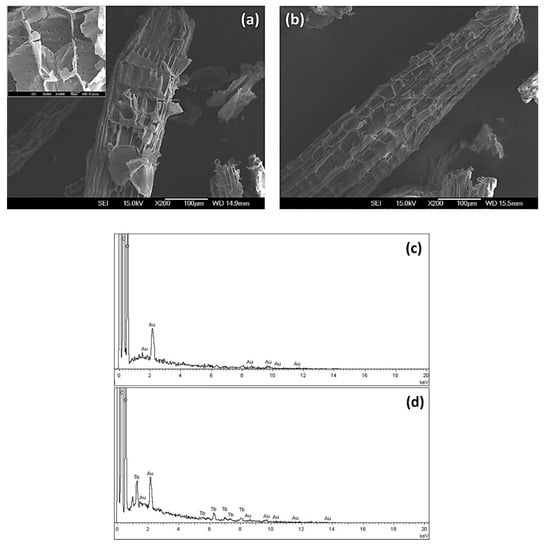 Finally, the bioadsorbent surface before adsorption (CRS) and after terbium adsorption (CRS-Tb) was studied via SEM. Figure 7a,b shows the SEM micrographs of both samples, in which the characteristic fibers of cellulose can be observed; the corresponding EDS spectra are also shown (Figure 7c,d).