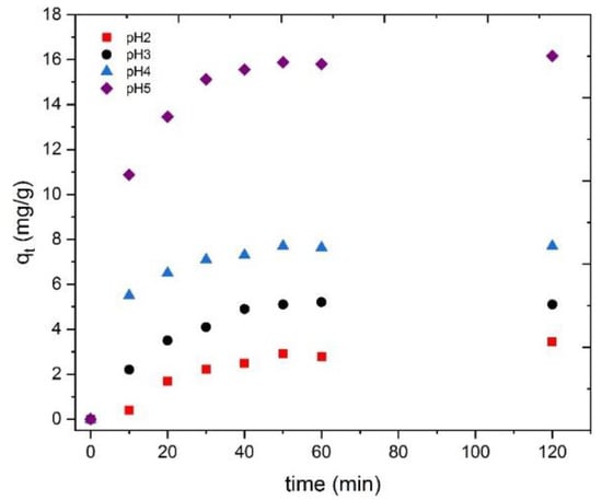 Figure 9 shows that the percentage of Tb(III) adsorption decreases as the pH value decreases, reaching a minimum value of 4 mg/g (corresponding to 16% of adsorption) at pH 2, as the interactions increase between H+ and Tb3+ to bind the active sites. The scarce protonation of the functional groups presented in the bioadsorbent also inhibits the reaction between the bioadsorbent and Tb3+ species, which could be of great importance, indicating a lower value of adsorption efficiency as the pH of the solution decreases [56]. The influence of solution pH on Tb(III) adsorption was not investigated for pH values greater than 5 to prevent terbium ions from precipitating as hydroxides. Therefore, pH 5 was applied as the optimum value for further adsorption studies.