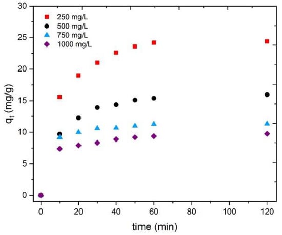 The adsorption capacity (qt (mg/g)) was defined using Equation (2):