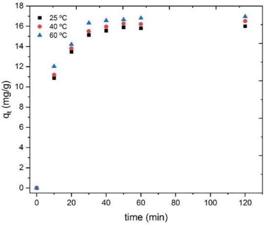 To analyze the kinetics of the adsorption process, the experimental data obtained under the different temperatures tested were plotted using different models (Equations (6)–(9)): pseudo-first-order, pseudo-second-order, Elovich, and Bangham. The obtained correlation coefficients are summarized in Table 3. Experimental data in the temperature range of 25–60 °C fit well with the pseudo-second order kinetic model [65], with k2 values of 0.021 ± 0.002 g/min·mg. In the model data, the value of qe,calc is about 16.9 mg/g, which matches closely with the experimental values near 16.5 mg/g.