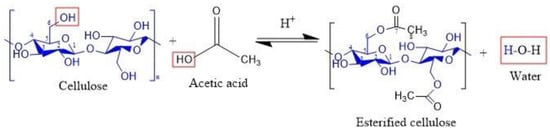 The esterification process of the cellulose is consistent with the Fischer esterification reaction that, according to the literature, occurs between a carboxylic acid and an alcohol in the presence of a catalyst to form an ester [51,52]. In this work, a reaction occurring between acetic acid and the hydroxyl groups of cellulose is proposed (Figure 12), in which HNO3 acts as the catalyst to obtain the esterified cellulose along with water as a side product.