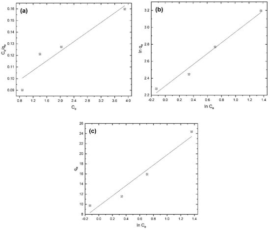 Linearized adsorption isotherms for (a) Langmuir, (b) Freundlich, and (c) Temkin at 25 °C.