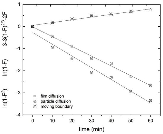 To analyze the rate law governing the adsorption process, three different possible adsorption mechanisms were studied [27]: the particle diffusion model (intraparticle or internal diffusion; the diffusion of Tb(III) within the bioadsorbent); the film diffusion model (bulk diffusion and external film diffusion; the diffusion of Tb(III) ions from the aqueous solution to the bioadsorbent surface); and the moving boundary process (Equations (10), (11) and (12) respectively):