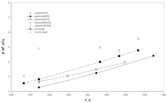For liquid Au (Figure 3), the experimental results on the self-diffusion coefficient are not available. There are two ab initio [66,67] and three classical [59,62,68] MD simulations at different temperatures. The discrepancy between these results is very big. For example, the result of the work [62] obtained is approximately three times bigger than the corresponding value of which can be approximated from Figure 3 of the work [66] at the same temperature. On the whole, the classical MD simulations (except for [59]) give significantly higher values than ab initio MD simulations. Our result lies very close to the ab initio MD results of Peng et al. [67], which are approximately average between the ab initio MD results of [66] and the classical MD result of [59].