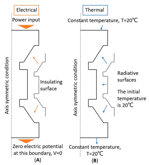 Assumed spark plasma sintering (SPS) model’s boundary conditions for (A) electric and (B) thermal fields.