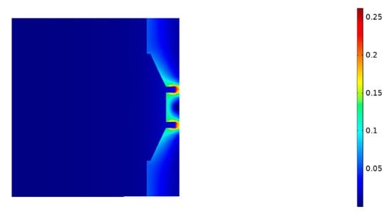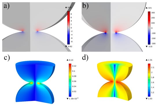 The electro-magnetothermal effect is summarized in Figure 5 for a copper sphere with a diameter of 100 µm and current density of 60 kA/cm2 (6 × 108 A/m2) under a discharge time of 50 ms. The effect of the neck growth was investigated for contact areas of 154.94 and 754.77 μm2.