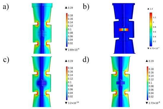 According to Figure 4, the magnetic field strength depends strongly on the materials properties. For graphite and alumina, the magnetic field distribution is relatively uniform. The peak value of magnetic strength is 0.19 T, and it radially increases. For iron, the magnetic field distribution is different, the peak value of magnetic strength is 1.4 T (much larger than 0.19 T), and the magnetic intensity of the sample is much higher than those of the surrounding components. The intensity of the magnetic field increases with the radius and reaches the maximum value at the edge of the sample. It needs to be pointed out that the properties of ferromagnetic materials changed drastically when the temperature exceeded the Curie point, due to the ferromagnetic to paramagnetic transition. In Figure 4d, the temperature of the iron sample exceeded the Curie point, and the peak value of the magnetic field strength reduced from 1.4 to 0.19 T.