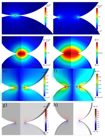 Comparison of electro, thermal, and magnetic effects for 100 µm copper sphere discharged under a current density of 60 kA/cm2, with the first column for small contact area and second column for large contact area (154.94 and 754.77 μm2, respectively). (a) Current density distribution graph for small contact (peak current density was 7.59 × 1010 A/m2) and (b) large contact area (peak current density was 2.45 × 1010 A/m2). The temperature distribution graph under (c) small and (d) large contact area. Magnetic field distribution with arrows indicating the Lorentz force for (e) small contact area (peak magnetic intensity reached 0.13 T) and for (f) large contact area (peak magnetic intensity reached 0.06 T). Z-axis component Lorentz force contribution for (g) small contact area (max of 9.65 N/mm3) and (h) for large contact area (max of 1.08 N/mm3).