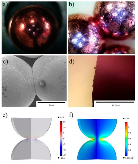 Figure 7a shows the surface of the copper ball before application of an electric current, and the surface was smooth. Figure 7b,c show the overall morphology of bonded particles after application of a 15 kA/cm2 discharge for 0.4 s. The two copper balls were bonded together well at the contact position. Surprisingly, there are many protrusions on the surface of the copper ball that might originate by the molten material being ejected due to the Lorentz force. Figure 7d shows a similar observation when using a current of 7.5 kA/cm2 for 0.6 s. Figure 7e,f map the Lorentz force and magnetic distribution, and the peak value was iron at 15.7 N/mm3, which is sufficient to promote molten metal ejection under a high current density [40].