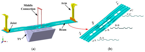 TV bracket model (a) and the typical section characteristics of the beam part (b).