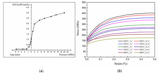 Pressure- and gap-dependent heat transfer coefficient HTC (a) and stress-strain curves of 22MnB5 at different conditions (b).