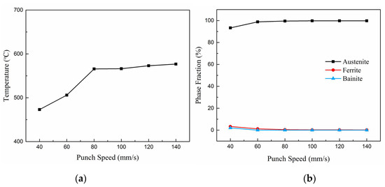 Variation of the minimum temperature (a) and phase fractions with the punch speeds (b).