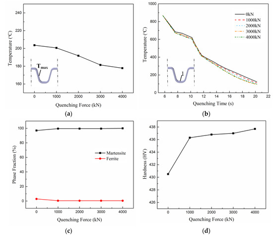 Variation of the maximum temperature (a), temperature histories (b), phase fractions (c), and minimum hardness with the quenching forces (d).